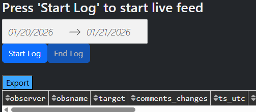 The user can initiate the log by pressing ‘Start log’, and ‘End log’ will stop the refresh cycle as shown above. The initial pull may be long if the log is refreshed deep into an observation, but it will dynamically speed up to prevent a bottleneck.